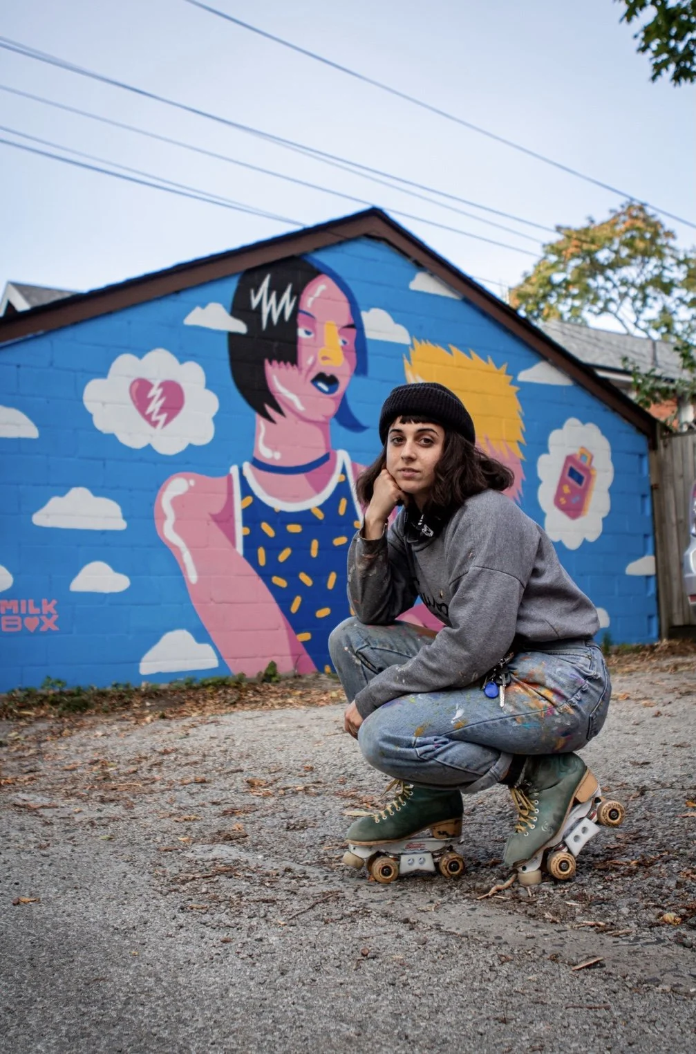 Kayla Buium, the street artist known as Milkbox, is an illustrator and professional rollerskater from Toronto, Canada. She uses bright colours and rubbery characters to spread positive messages to her community. Milkbox gained recognition for her work while studying at OCAD University in Toronto. Throughout her studies she was approached byUber Eats, Tim Hortons, The Hilton Hotel, and was featured in “Its Nice That” Magazine. However, Milkbox dreamed of painting large scale murals, assisting alongside internationally acclaimed street artists such as Okuda San Miguel, Alfalfa, Birdo and Ola Volo in order to develop her skills as a mural artist.